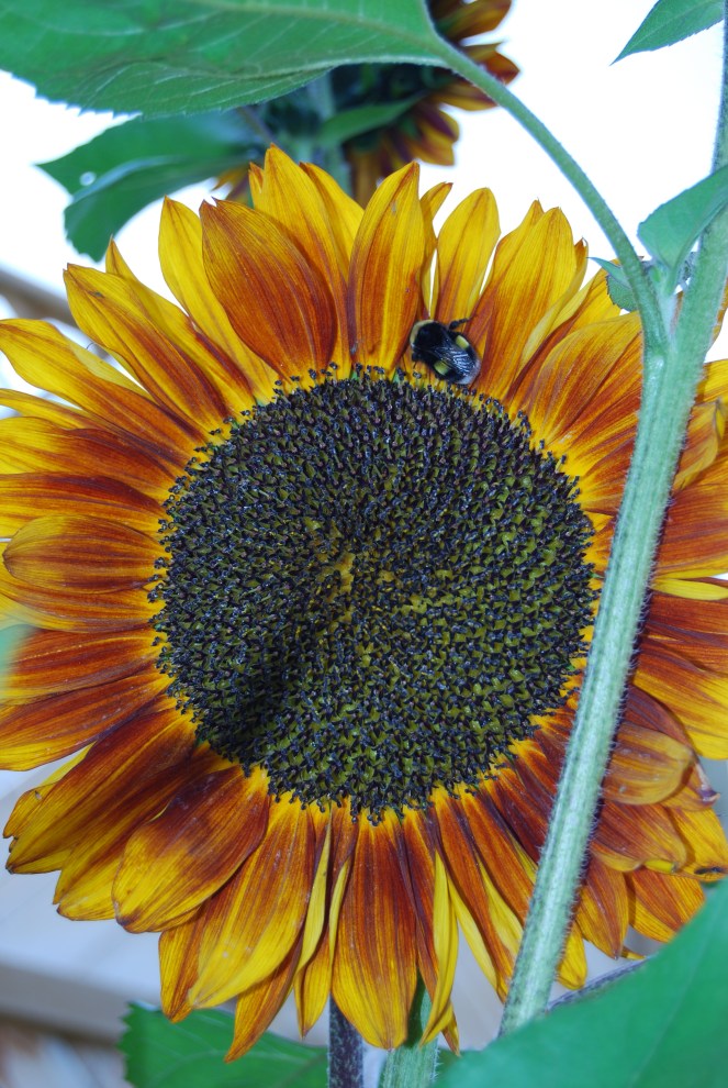 With a majestic height reaching to the sun, and a thick hairy stem that is often over looked, this is a stalk that’s size is such that stories that shame Jack and the Beanstalk live in its branches. However, people’s eyes travel up past the healthy shoots of triangular toothed shaped leaves to the flower head at the end of the branch. It is a large round show stealer with a brown pocked center that is dusted with a pollen yellow. Pointed oval shaped petals encircle the center. The petal itself is rippled with waves. Its colour variegated: yellow, yellow-orange, orange, red-orange, and back again.