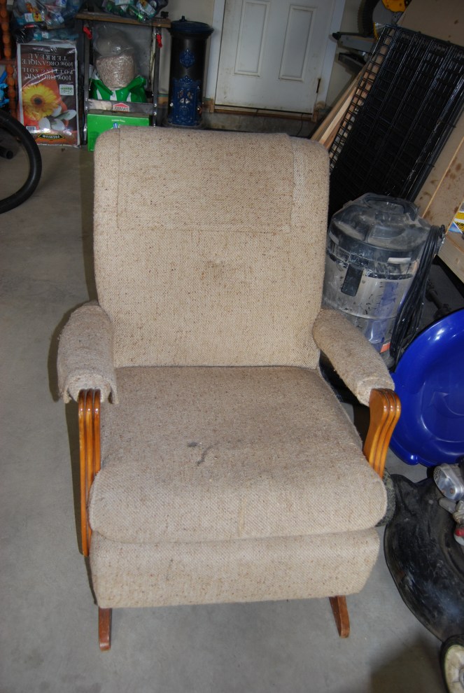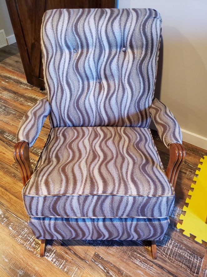 Something in my gentle to-and-fro motion promises an enjoyable experience. As a result I pride myself on my ability to elevate the mood of my confident. In recognition of the enjoyment of these qualities my thin and tatty coverings were stripped and redressed. Although my wood arms still display the evidence of age, I feel returned to health and a normal life. My springs give a short high-pitched creak as my familiar uses their own muscles and tendons in their lower body to oscillate us, but it is a song of freedom from constraint.
