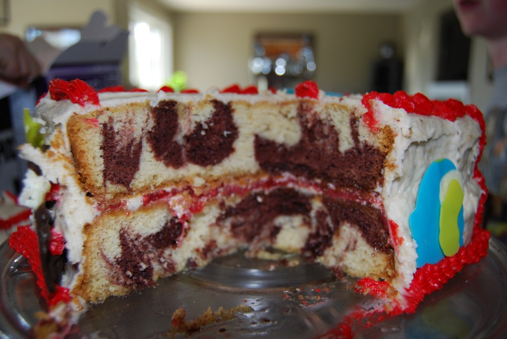 If we were having coffee I would end with sharing images from my youngest son’s birthday cake. My house was to hot when I was icing so I am a bit disappointed with the appearance but the flavours were a hit: banana frosting, marble cake and homemade strawberry filling.