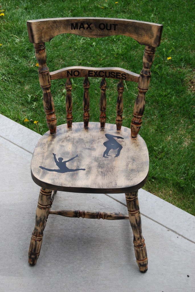 If we were having coffee that would lead me to my next item for sharing. The weather is here for me to start back-up with my furniture project. I started with this chair and turned it into a piece for my home exercise space. Next is a stand that I would like to re-finish for my TV and then the coffee bar.